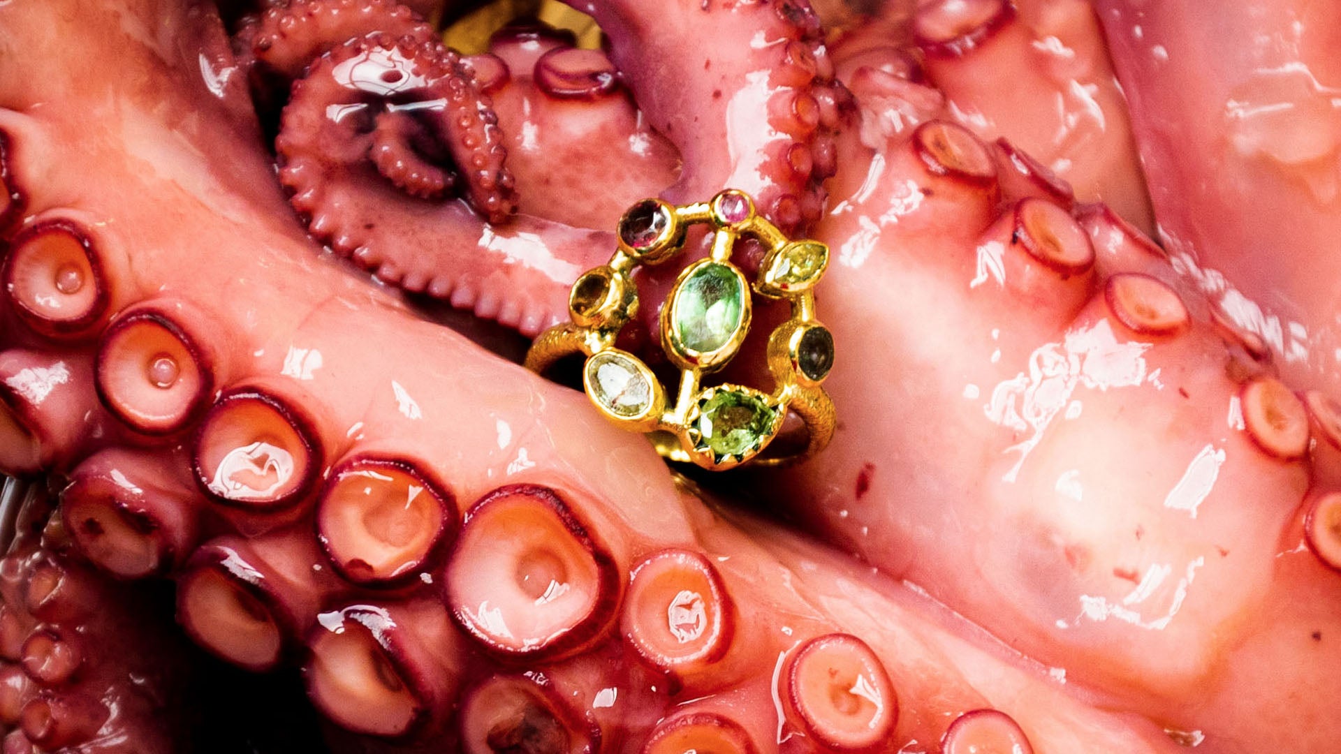 Bague cocktail en Rubis rose dorée à l'Or fin et Multi pierres - Queen