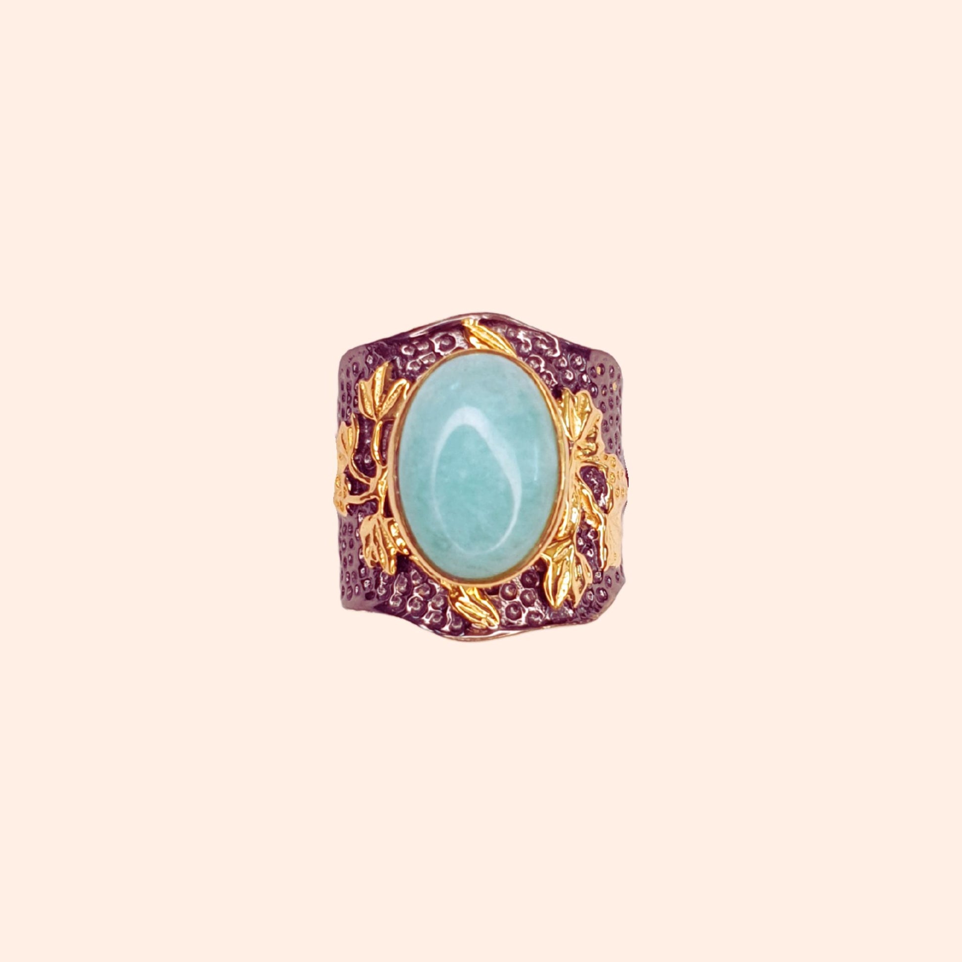 La Bague amazonite Or La Vigna est un anneau large martelé en laiton émaillé de noir et doré à l'or fin 18 carats. La pierre centrale est identifiée comme une amazonite naturelle, taillée en cabochon ovale, avec un éclat vert d’eau et des variations subtiles. L'anneau large présente une texture martelée, avec des motifs de feuilles de vigne dorées entourant la pierre, donnant un aspect "antique" et original à cette bague. Le style s'inscrit dans un esprit bohème-chic ou vintage, parfait pour celles qui recherchent un bijou statement. Cette bague pierre véritable peut être portée seule pour un look sophistiqué ou en accumulation avec d'autres bagues pour un style plus audacieux, convenant aussi bien à un usage quotidien qu'à des occasions spéciales.