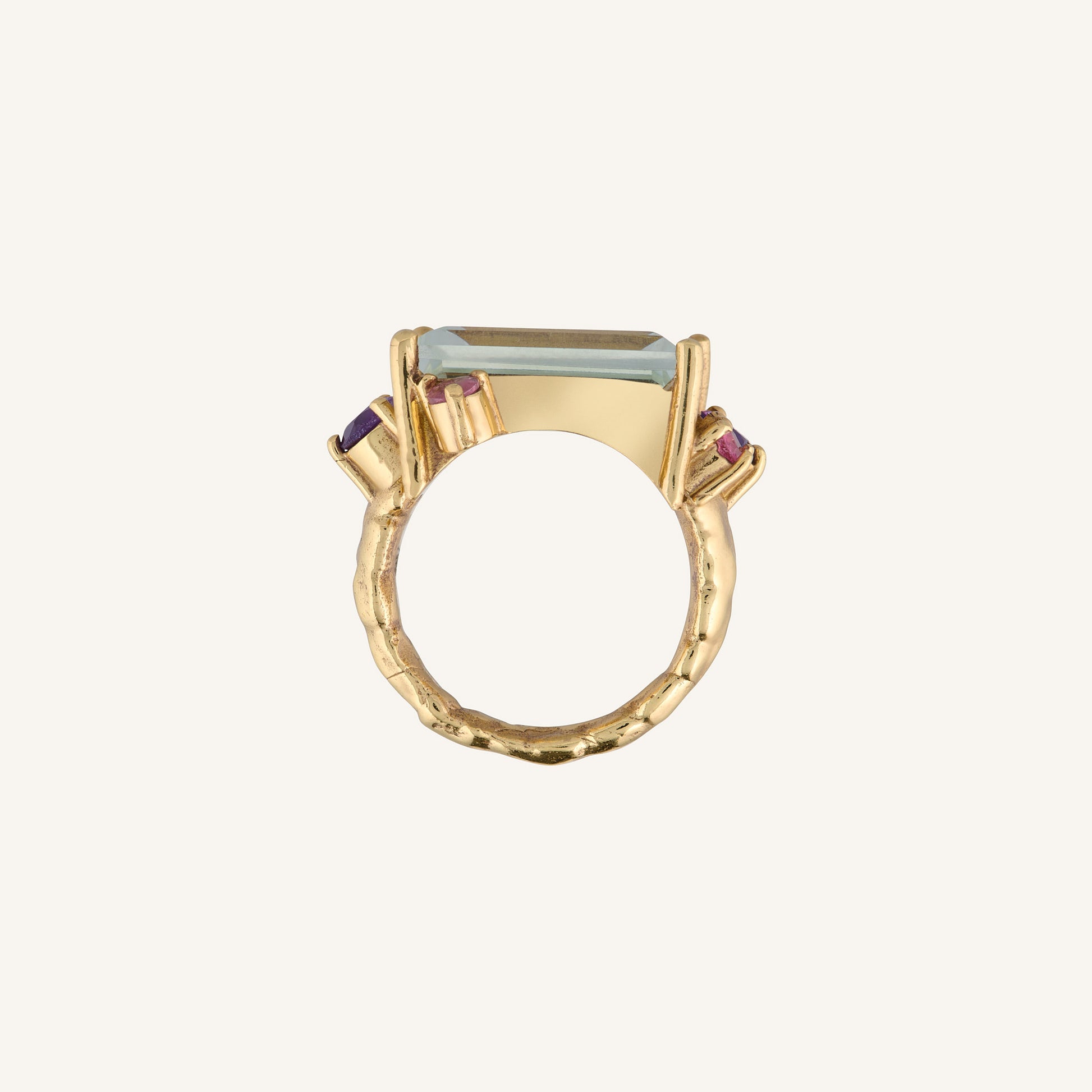 Bague Améthyste Verte Centrale avec Tourmalines Roses et Améthystes Asymétriques