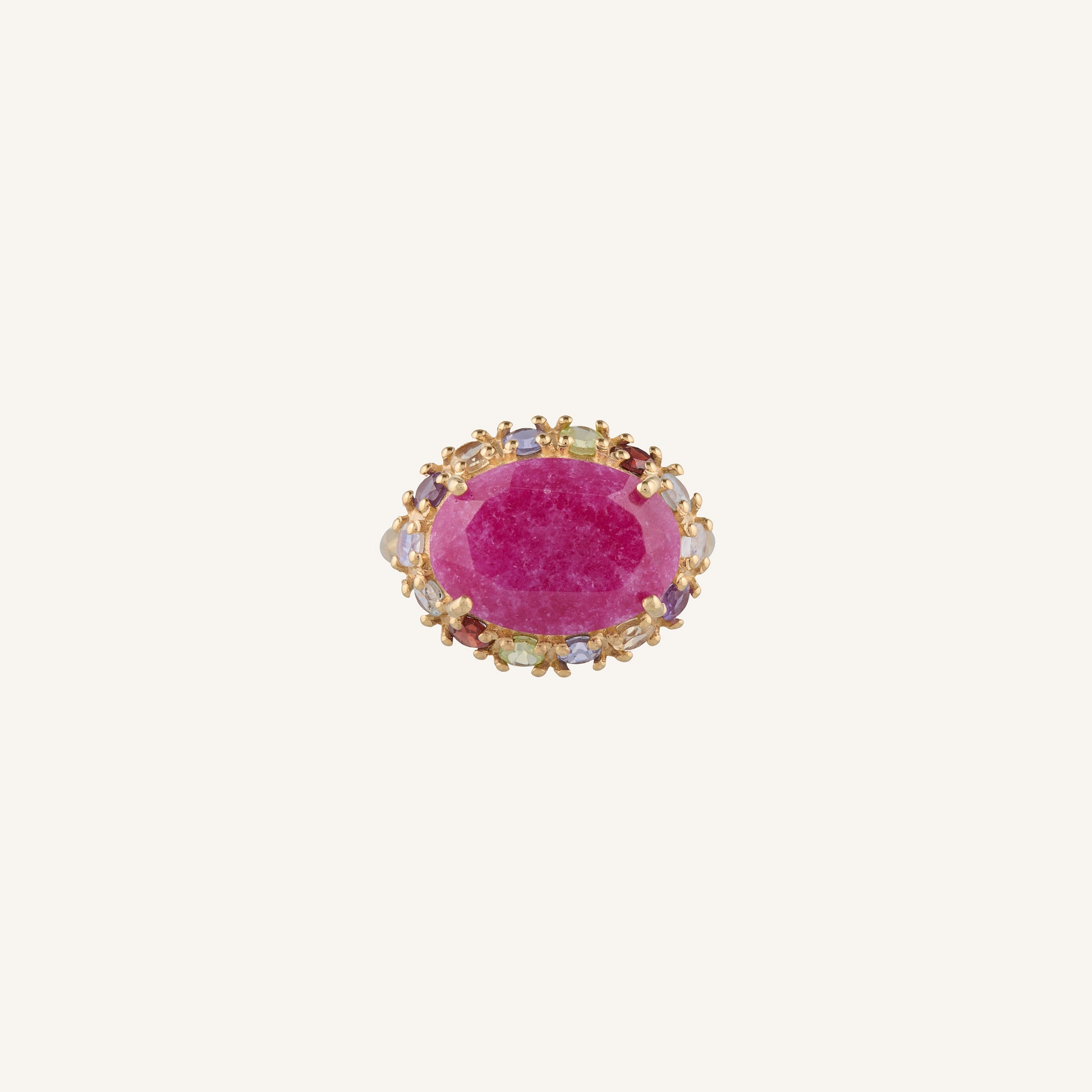 Le rubis rose, pierre naturelle aux nuances rosées subtiles, est sculptée en ovale facetté (environ 14 mm x 10 mm). Elle s'entoure d'un pavé de fines gemmes scintillantes (pierre de lune, améthyste, citrine, iolite, péridot, grenat, aigue-marine), serties avec précision sur un anneau de laiton massif doré à l'or fin, conférant une luminescence veloutée et sophistiquée.