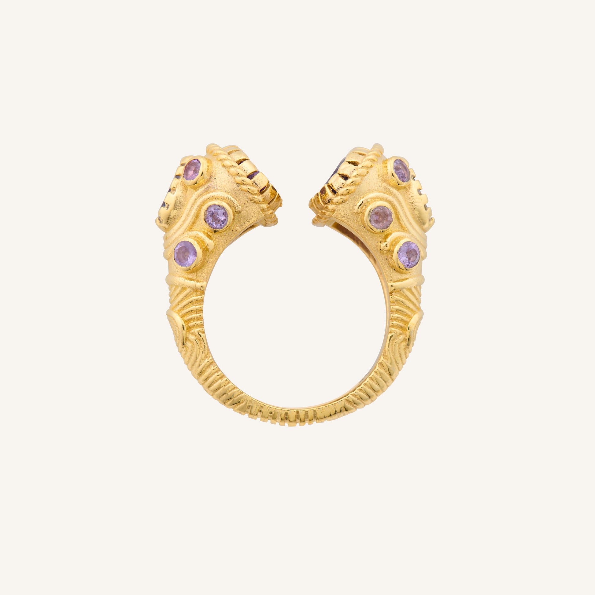 La bague Jaipur en Améthyste a une forme ouverte qui lui donne un aspect précieux tel un joyaux moghol. L'anneau entièrement ciselé est serti de micros griffes de forme ovale et composé d’améthystes facettés d'environ 7 et 10 mm de circonférence. La bague Asté est ornée de 16 améthystes de tailles et de formes différentes. La monture de la bague est richement décorée de griffes et de torsades. Ces détails ajoutent un aspect ancien à la bague. L'ouverture permet d'ajuster la bague à votre doigt lors du premier essayage.