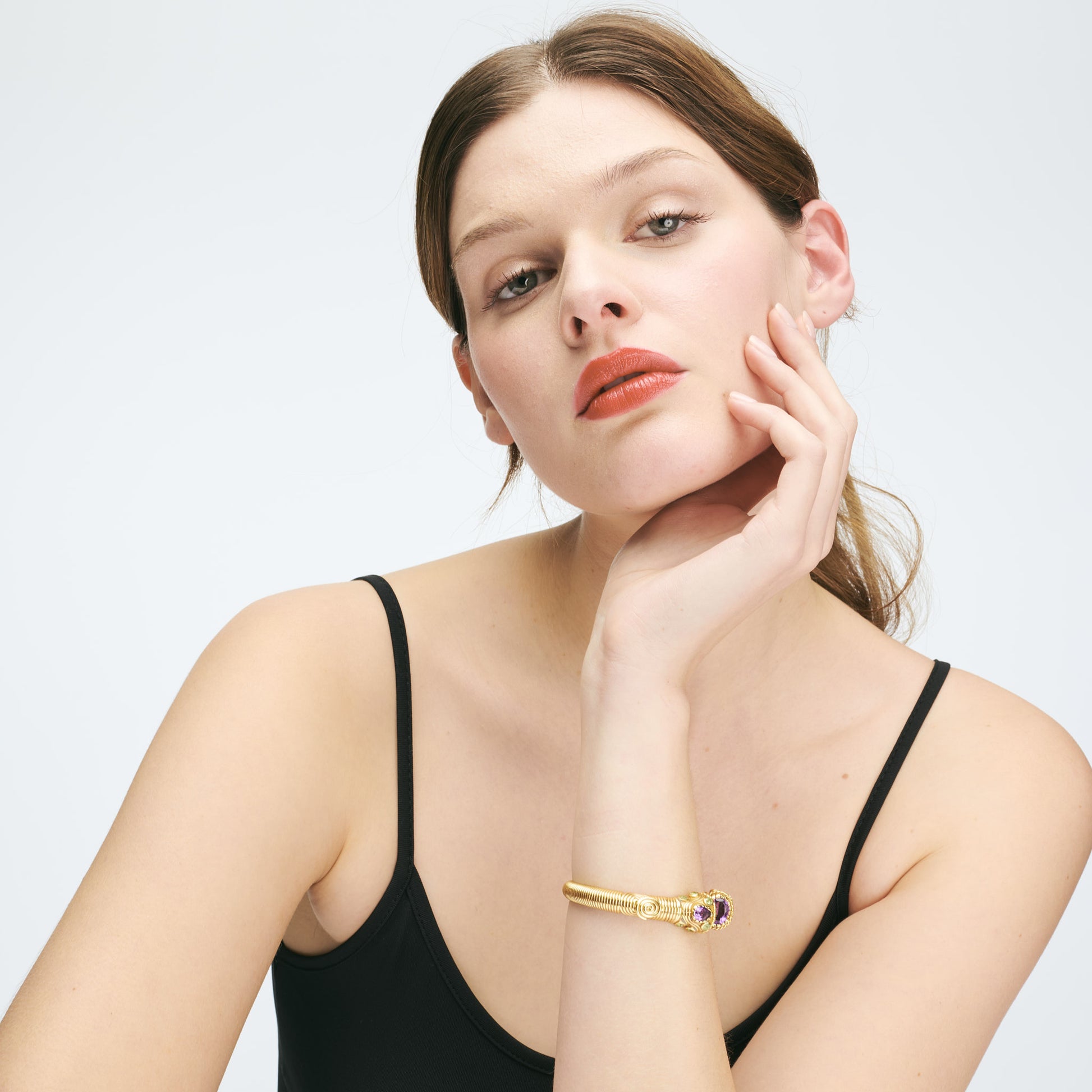 Le bracelet jonc indien Dolki en Améthyste et Péridot a une forme ouverte qui lui donne un aspect précieux digne d'un bijou de maharadjah. Le jonc entièrement ciselé est serti de plusieurs petites griffes retenant des améthystes de forme ovale et facettées d'environ 7 et 10 mm de circonférence. Le jonc Dolki est orné de 20 pierres de tailles et de formes différentes. Les améthystes ont un éclat intense et les péridots se marient à merveille et apportent de la douceur. Le bracelet ouvert et ajustable est richement décoré de griffes et de torsades. Inspiré des bijoux indiens anciens, ce bracelet torque femme est une création unique qui se mariera à merveille avec la bague Asté améthyste. L'ouverture permet d'ajuster le jonc à votre poignet. Il convient à tous les poignets et se referme par entrecroisement pour les poignets les plus fins.