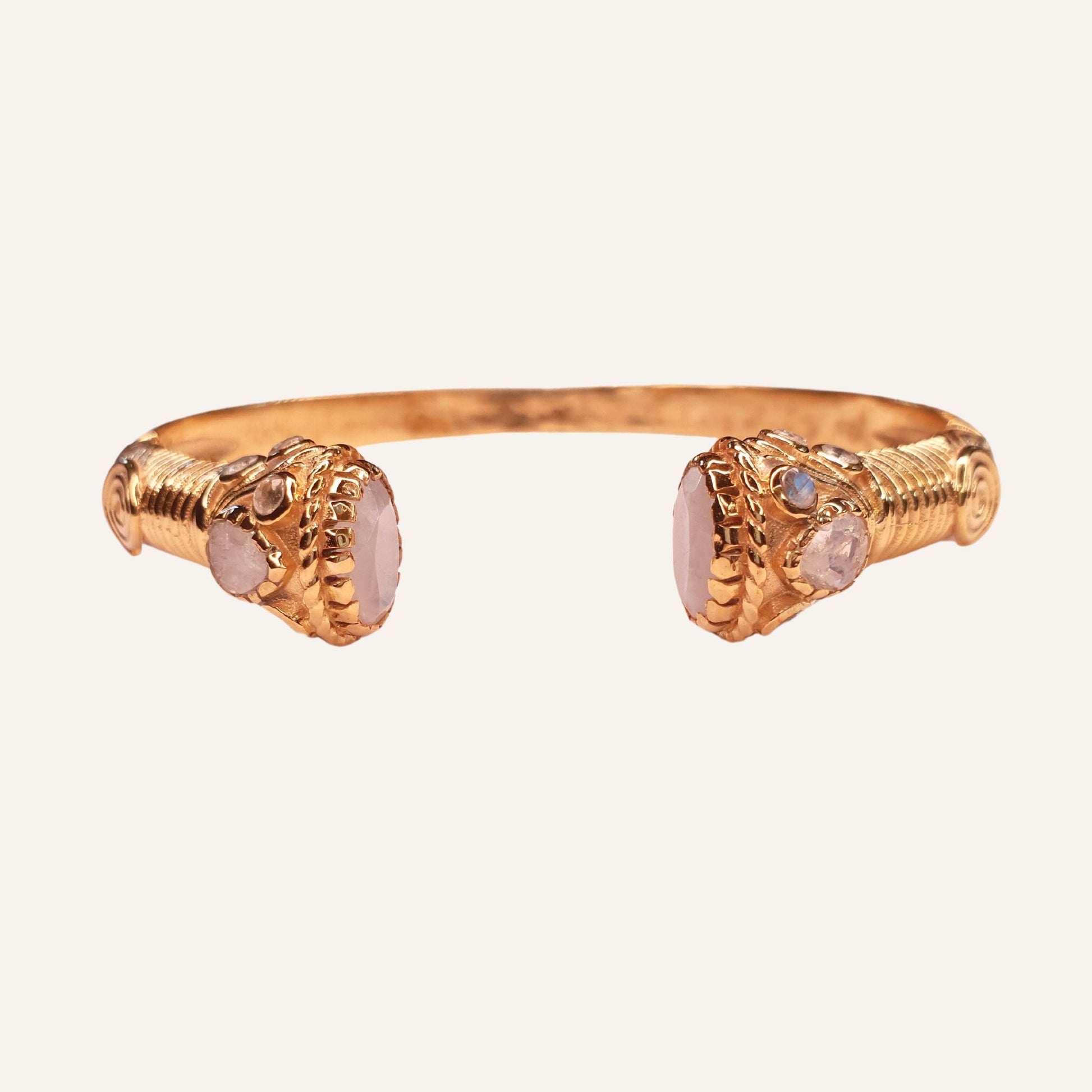 Le bracelet jonc indien Dolki en Pierre de lune a une forme ouverte qui lui donne un aspect précieux digne d'un bijou de maharadjah. Le jonc entièrement ciselé est serti de plusieurs petites griffes retenant des pierres de lune de forme ovale et facettées d'environ 7 et 10 mm de circonférence. Le jonc Dolki est orné de 20 pierres de lune de tailles et de formes différentes. Les pierres de lune ont un éclat doux et des reflets bleutés. Le bracelet ouvert et ajustable est richement décoré de griffes et de torsades. Inspiré des bijoux indiens anciens, ce bracelet torque femme est une création unique qui se mariera à merveille avec la bague Asté pierre de lune. L'ouverture permet d'ajuster le jonc à votre poignet. Il convient aux poignets forts et se referme par entrecroisement pour les poignets les plus fins.