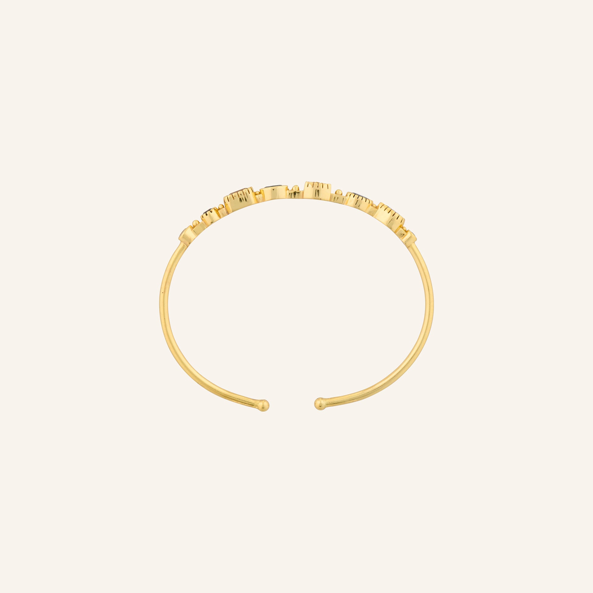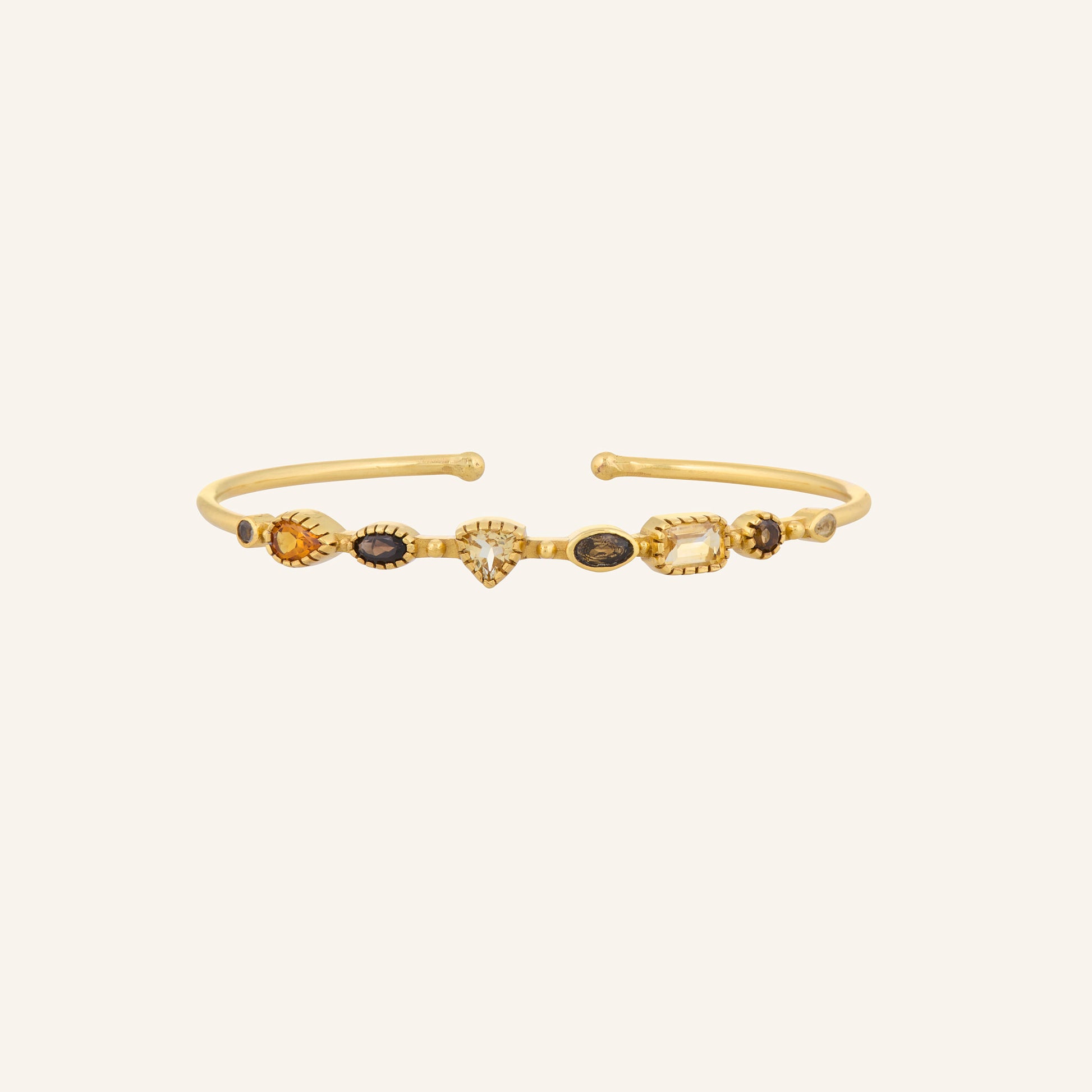 Découvrez notre bracelet Jonc Femme Pierres Fines ACitrine et Quartz fumé en laiton doré à l'or fin, un bijou tendance qui fusionne élégance bohème et éclat naturel des pierres fines. Le bracelet jonc pierres fines multicolores est un jonc fin rigide et ouvert autrement appelé bangle. Fabriqué à la main, ce jonc pour femme en laiton doré à l'or fin est serti de 8 pierres naturelles. Ce jonc ajustable orné de pierres multicolores – incluant des nuances de jaune chaud (citrine) et de brun foncé (quartz fumé) – est idéal pour sublimer vos tenues quotidiennes ou pour des occasions spéciales. Les pierres facettées de différentes tailles variant de 3 à 5 mm et de différentes formes sont serties griffe ou serties clos apportant une touche délicate et précieuse au bracelet. Taillées en facette, la transparence des pierres et le mélange des couleurs offrent un éclat sublime. Ce bracelet jonc Céleste est ouvert et ajustable afin de s'adapter à tous les poignets.