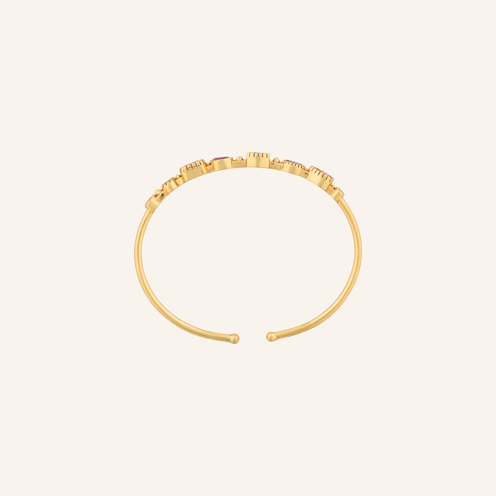Découvrez notre bracelet Jonc Femme Pierres Fines Rubis rose, Onyx vert, Cornaline en laiton doré à l'or fin, un bijou tendance qui fusionne élégance bohème et éclat naturel des pierres fines. Le bracelet jonc pierres fines multicolores est un jonc fin rigide et ouvert autrement appelé bangle. Fabriqué à la main, ce jonc pour femme en laiton doré à l'or fin est serti de 8 pierres naturelles multicolores. Ce jonc ajustable orné de pierres multicolores – incluant des nuances de rose profond (racine de rubis), de vert émeraude (onyx vert) et d'orange intense (cornaline) – est idéal pour sublimer vos tenues quotidiennes ou pour des occasions spéciales. Les pierres facettées de différentes tailles variant de 3 à 5 mm et de différentes formes sont serties griffe ou serties clos apportant une touche délicate et précieuse au bracelet. Taillées en facette, la transparence des pierres et le mélange des couleurs offrent un éclat sublime. Ce bracelet jonc Céleste est ouvert et ajustable afin de s'adapter à tous les poignets.
